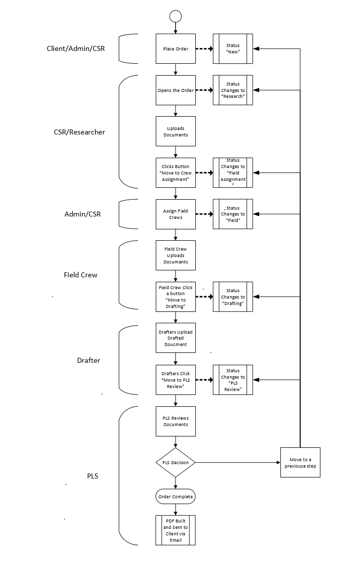 此项目是一套针对TerraCorp土地测量公司开发的测量订单管理软件,主要功能是全程跟踪测量订单的生命周期。该软件将由客户或者管理员放置一笔订单 开始,接着由公司调查人员(Researcher)处理该笔订单并实地调查后上传一些最终测量报告所需要的相关文档。一旦文档被调查人员上传后,订单将转 入下一流程由调度人员(Crew Scheduler)处理并分配相应的订单给现场人员(Field Crews)。现场人员将实地处理订单测量工作并上传所有订单相关的文档,然后流转订单流程给绘图人员(Drafting)。绘图人员将基于所有工作流程 中所上传的文档绘制订单测量图并上传,接着订单流转到最后一步,由专业测量员(PLS)查看所有流程中已上传的文档,并最终决定订单是否完成。如果订单完 成,PLS将最终生成PDF订单测量报告以及发票信息,并发送给最终用户,否则PLS将重新流转订单流程到以前的步骤让相关人员重新处理。